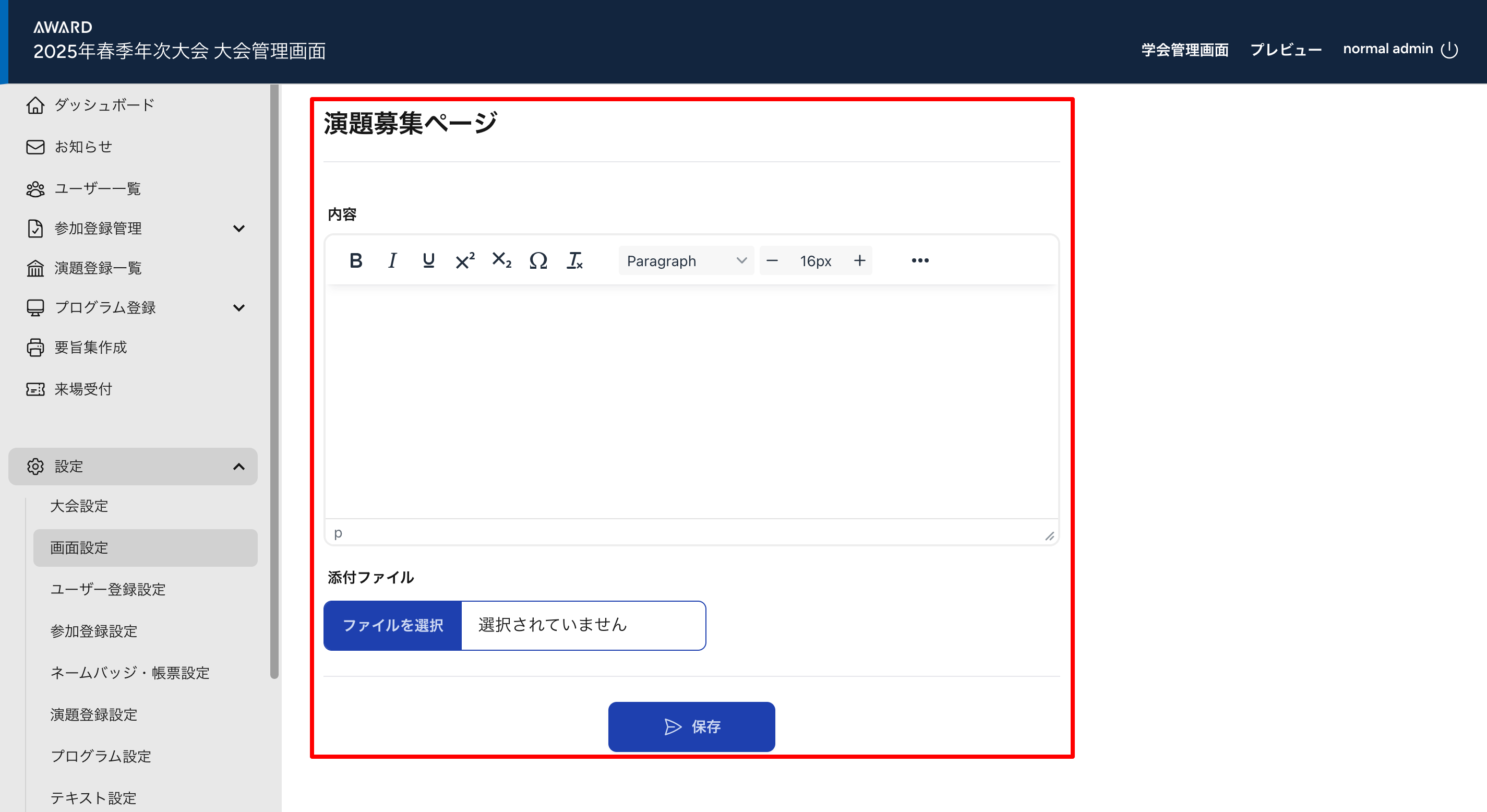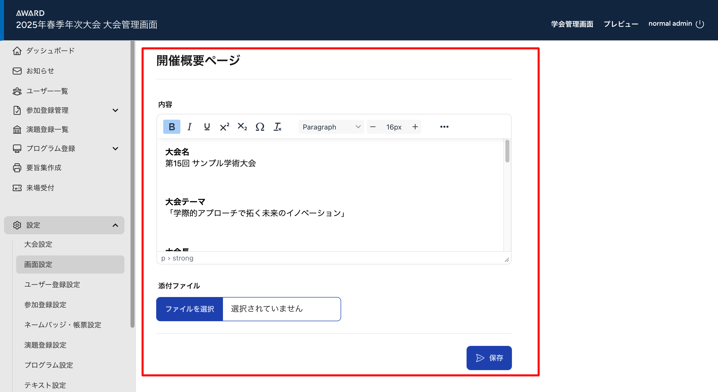 ページ記載内容の入力・添付ファイル(開催概要のPDF(チラシ)等)がある場合は、ファイルを設定しページの作成・保存をします。