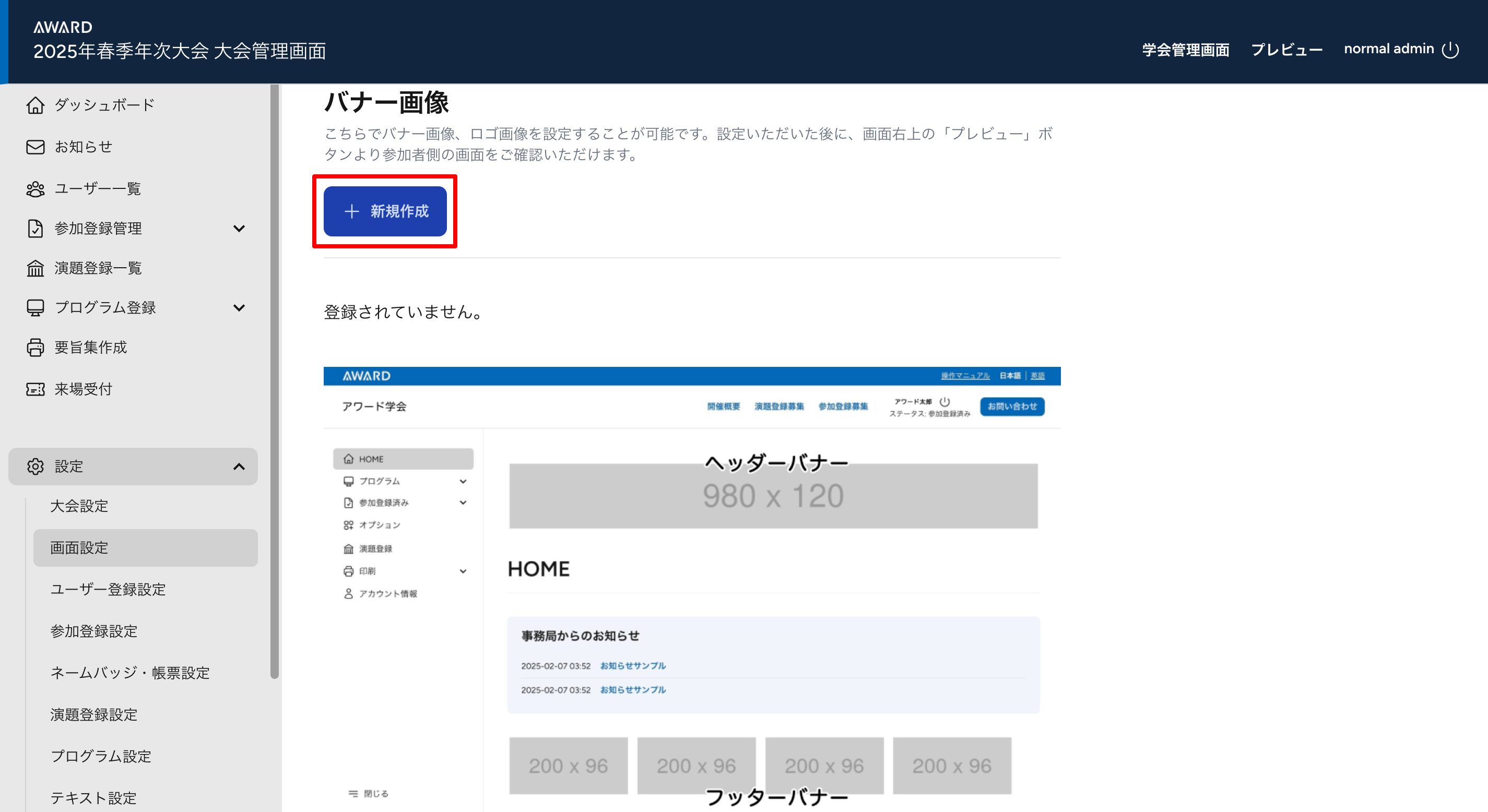 ヘッダーバナーの登録 > 新規作成をクリックします。
