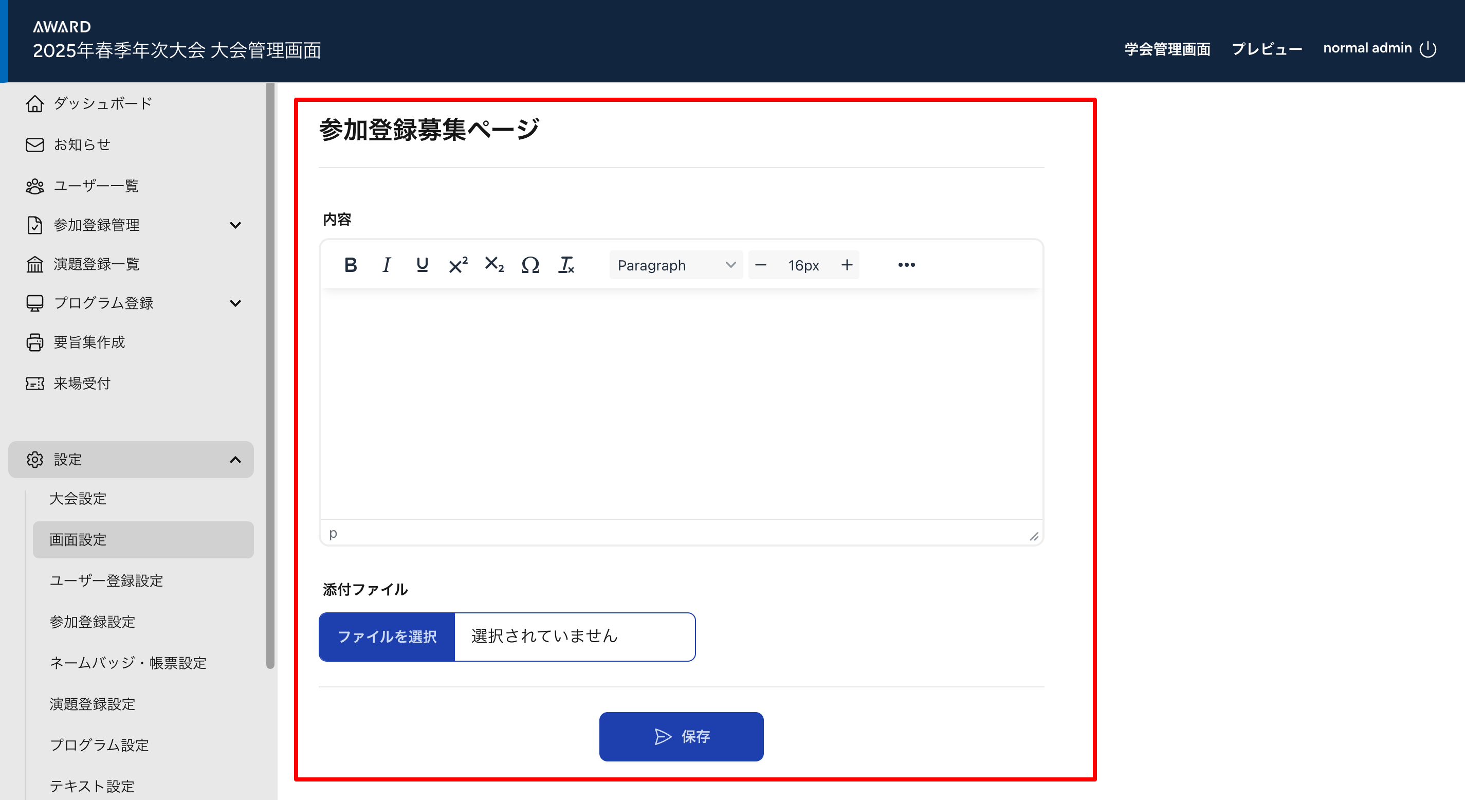 開催概要ページ・参加登録募集ページと同様に設定し保存をします。