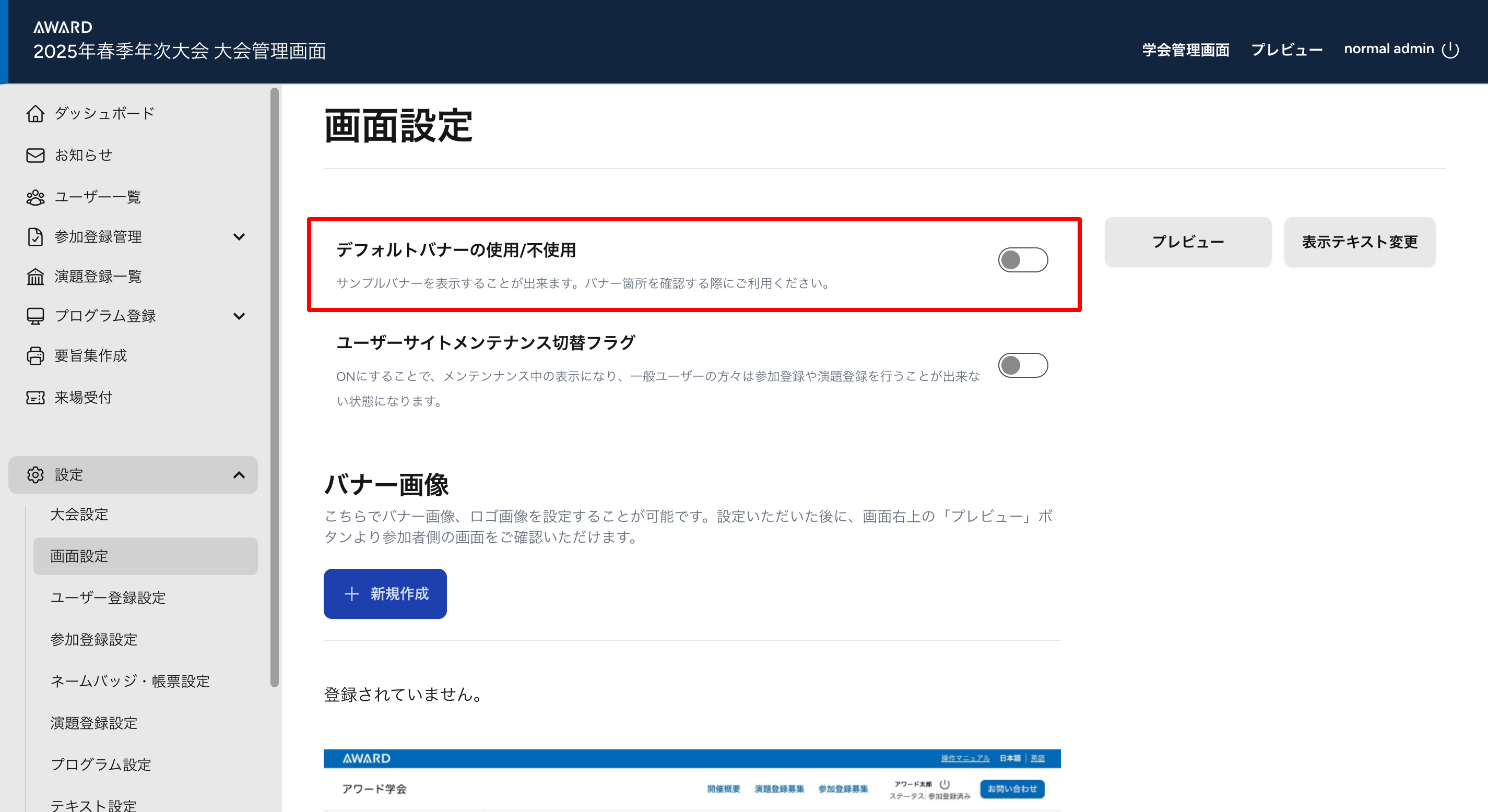 デフォルトバナーの使用/不使用 > ONにしてプレビューをクリックすると、バナー表示箇所の確認ができます。