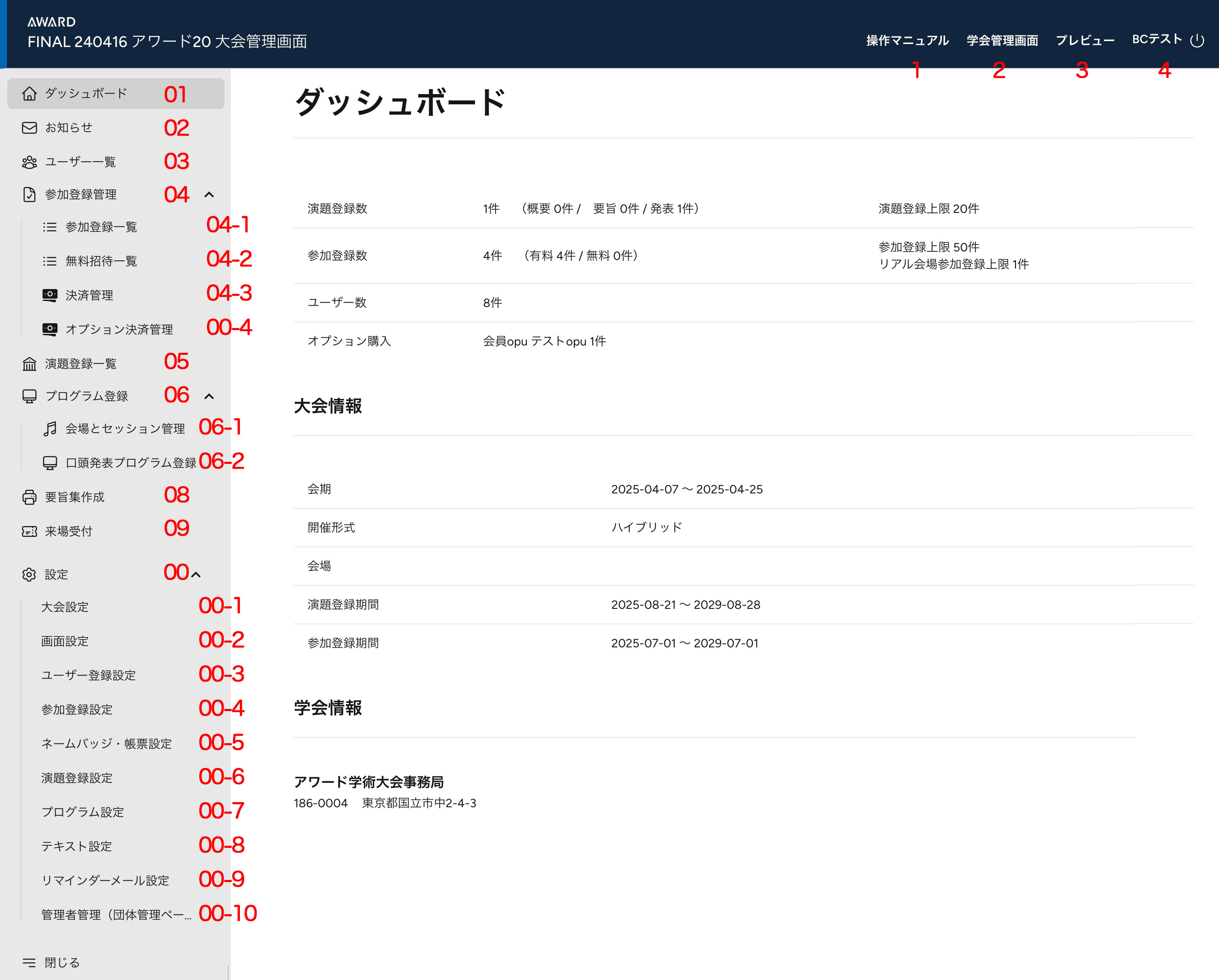 | 04 | 参加登録管理 | 04-1〜4のメニューが表示されます。 |