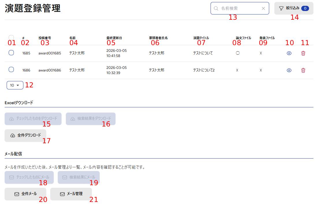 2A:大会管理画面>2A-06:プログラム登録>2A-06-2:口頭発表プログラム登録 口頭発表プログラム登録 「会場とセッション管理」で作成された、発表形式が「口頭発表」に指定された会場のプログラム登録画面です。 口頭発表の会場設定が無い場合は、このメニューは表示されません。 01:投稿番号 award~からはじまる自動で割り振られた番号です。(※手動で変更できません) 演題登録管理画面で確認できます。 02:演題タイトル 検索したい演題のタイトルを入力します。 03:筆頭著者氏名 ...