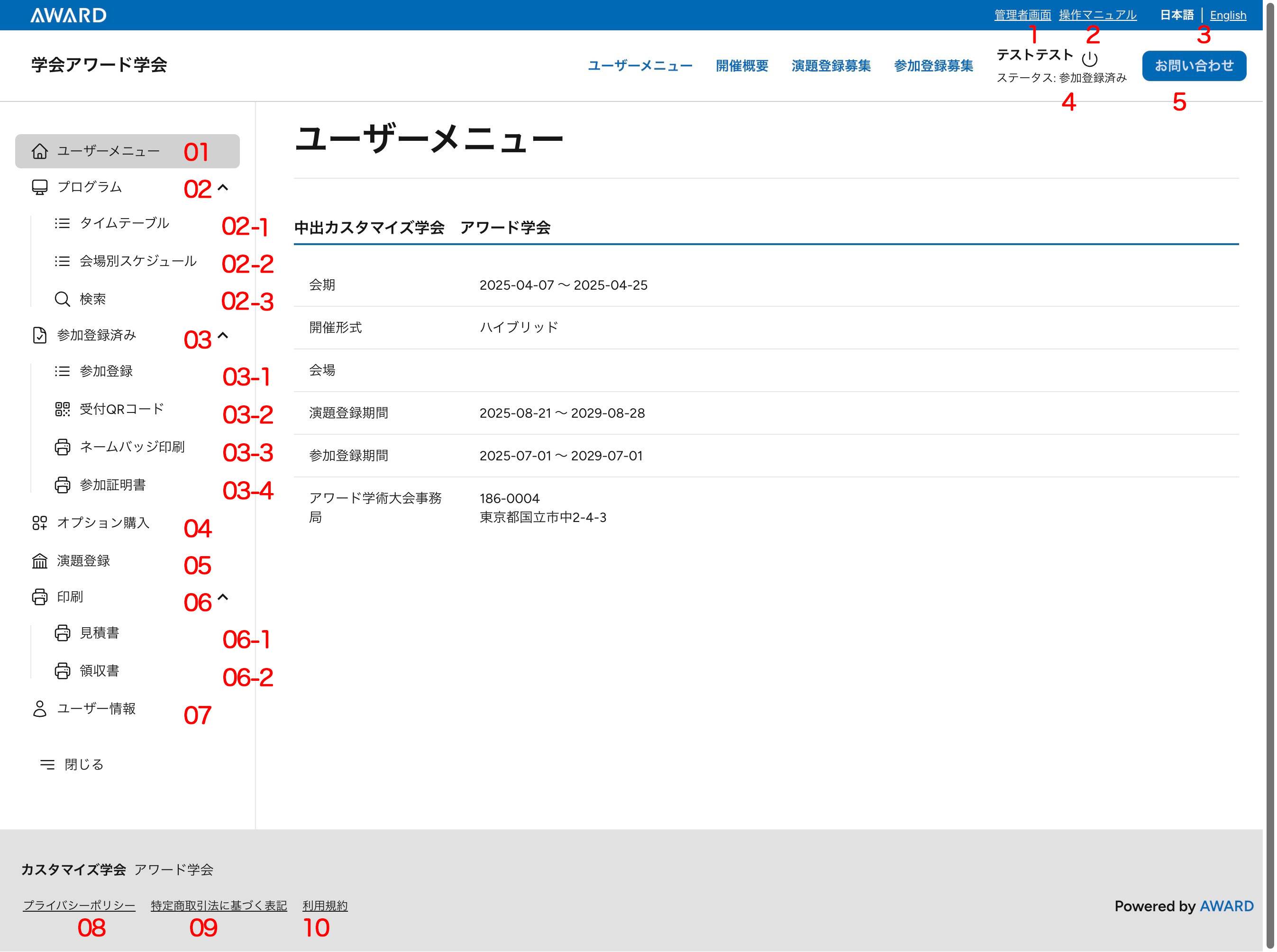 03 | 参加登録済み | 03-1〜4のメニューが表示されます。 参加登録入金完了前は「参加登録」と表示され「03-1」~「03-7」のメニューは表示されません。入金確認後、表示されます。 |