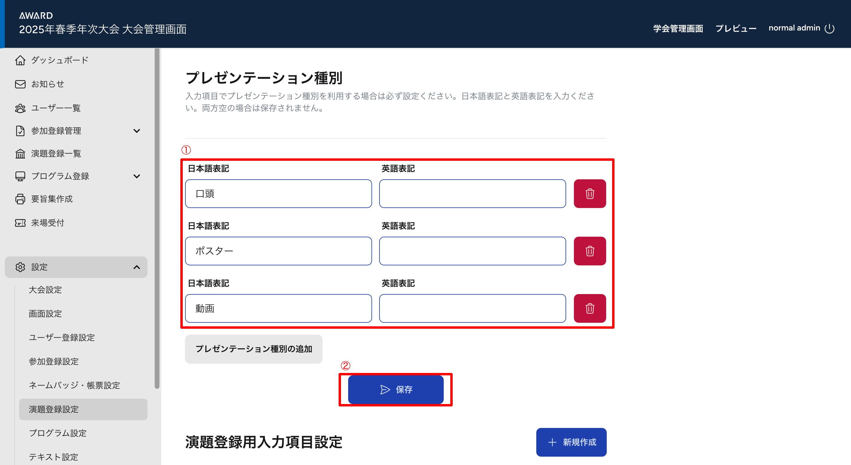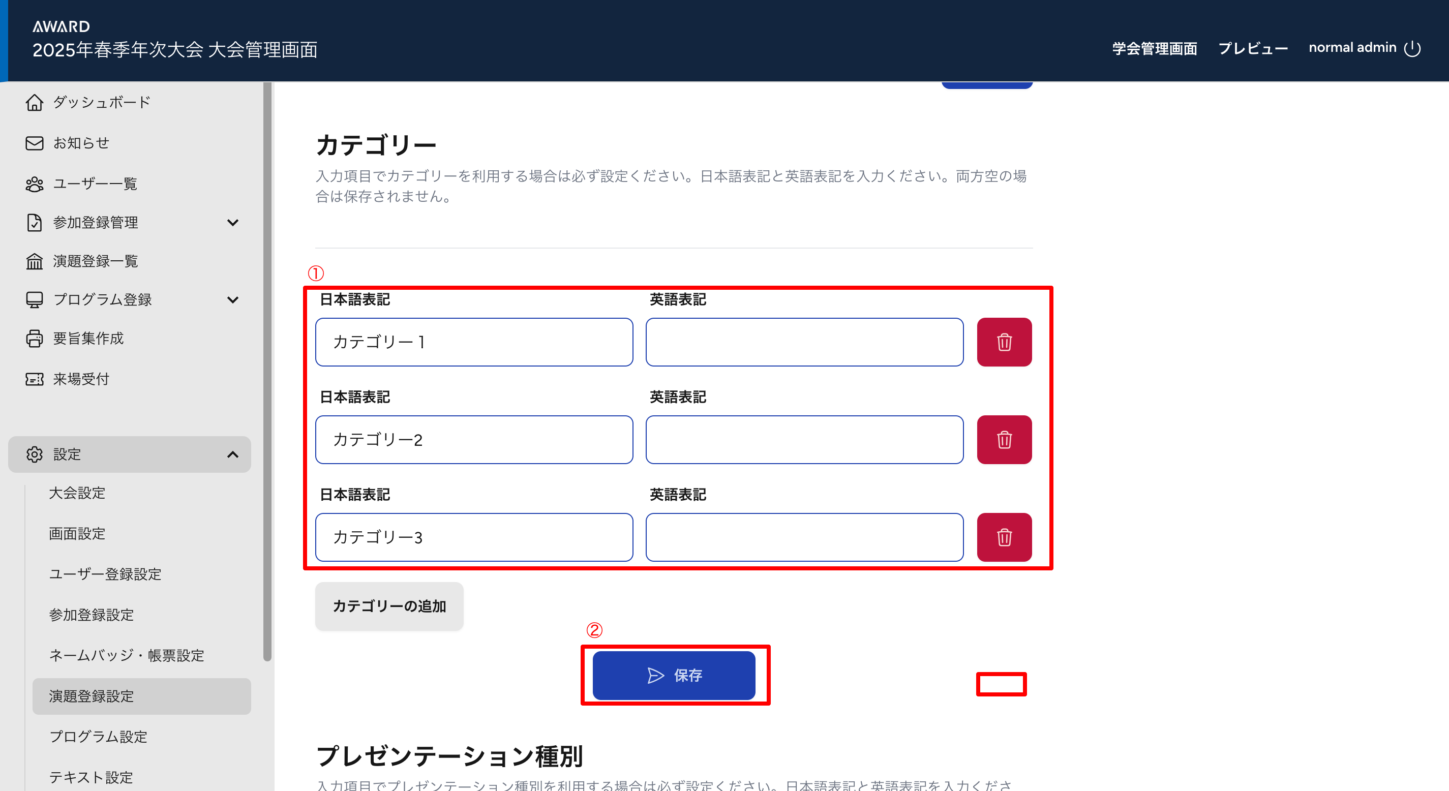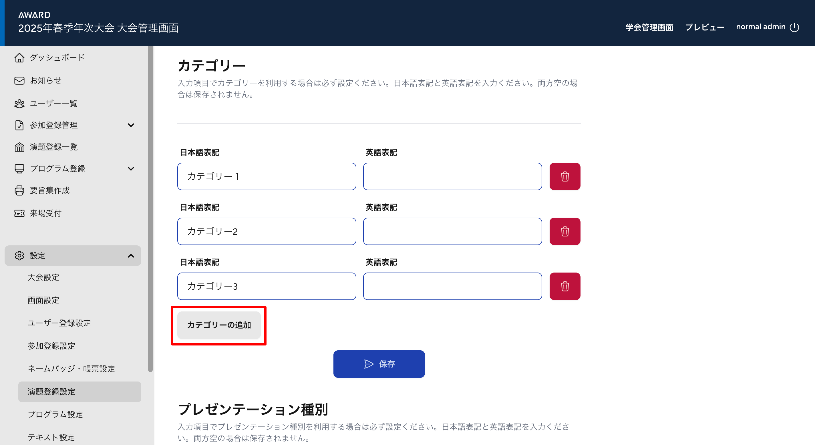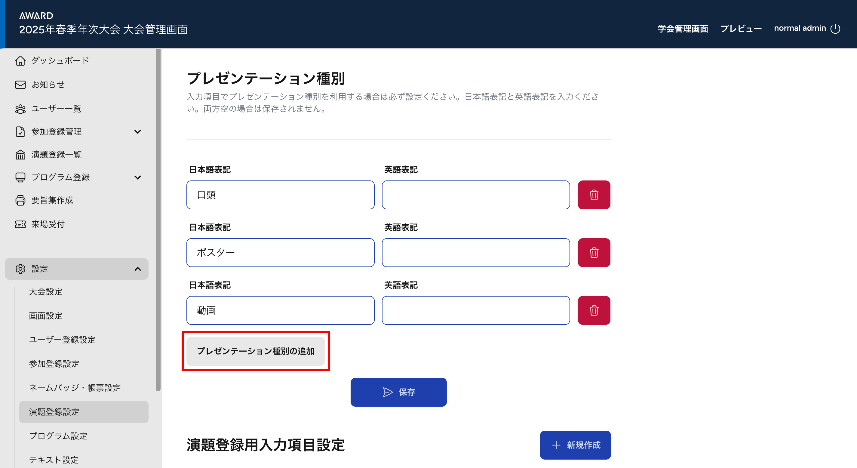 ・プレゼンテーション種別 > プレゼンテーション種別の追加をクリックします。