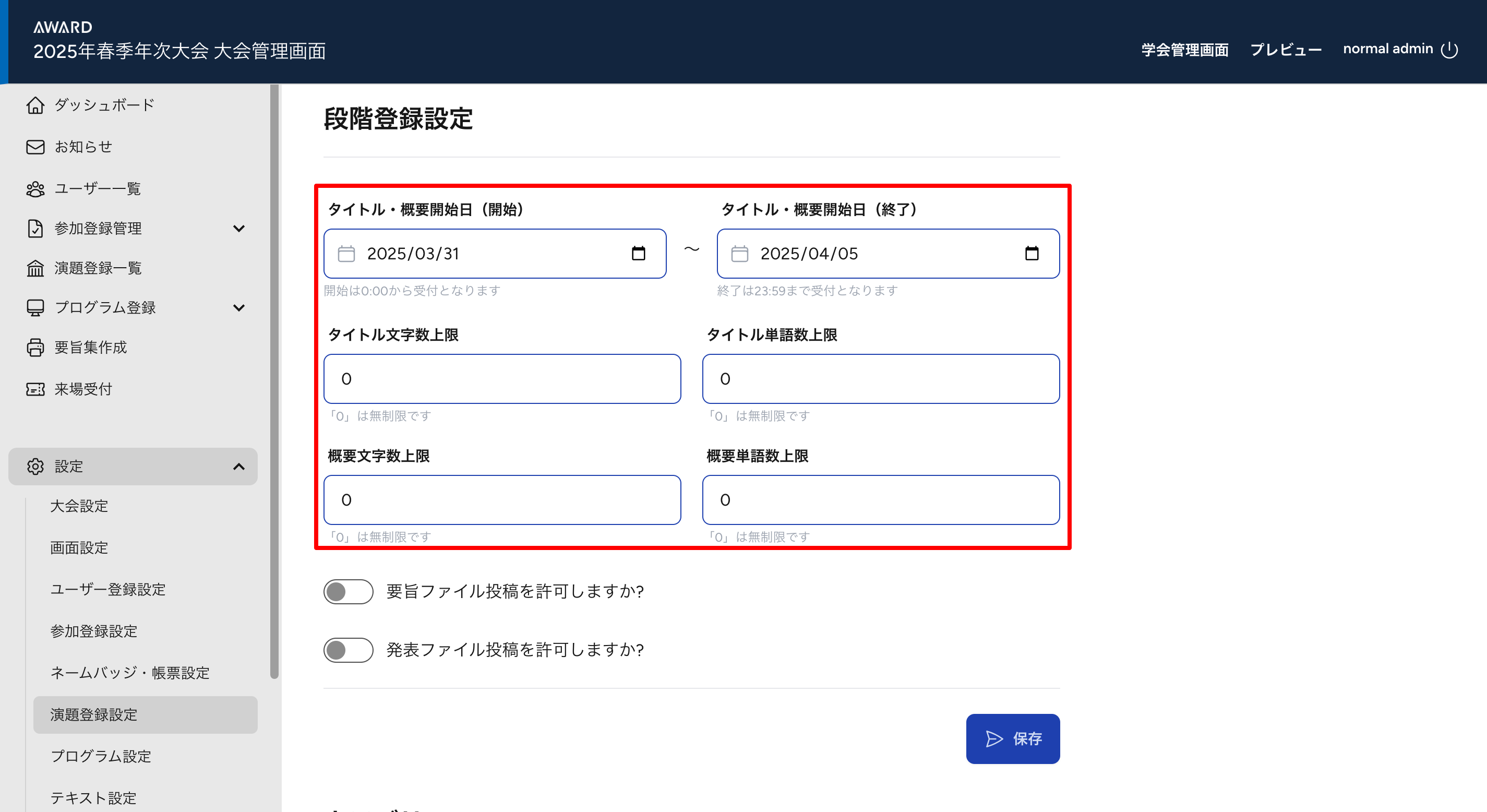段階登録設定は、【概要要旨ファイル・発表ファイル】の段階設定が可能です。