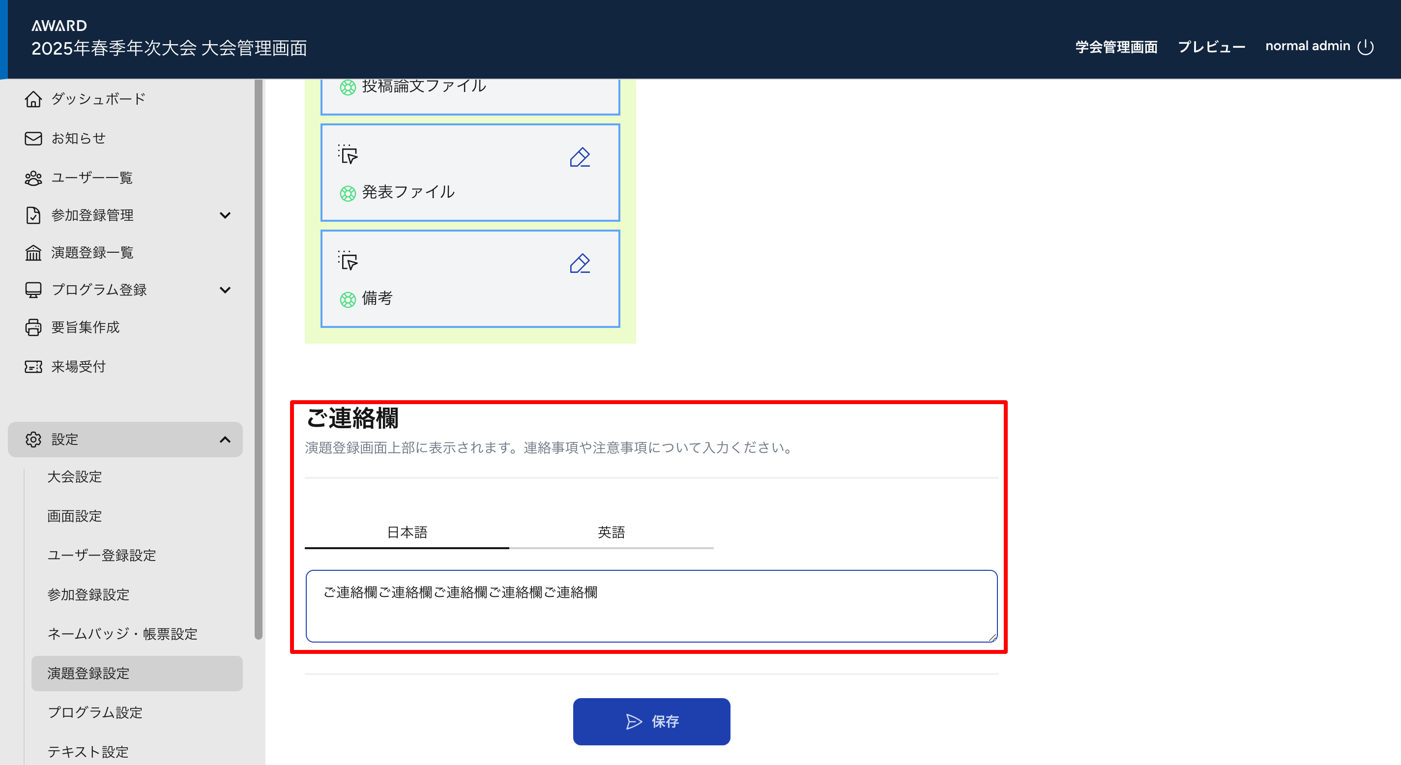 ・演題登録画面上部に連絡事項や注意事項を表示する場合は、ご連絡欄に文章を入力し、保存をクリックします。