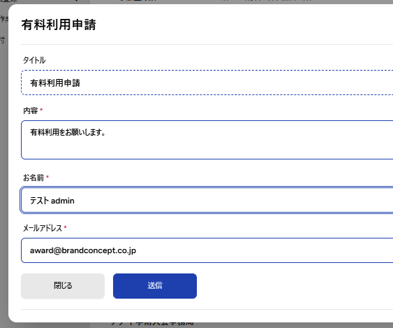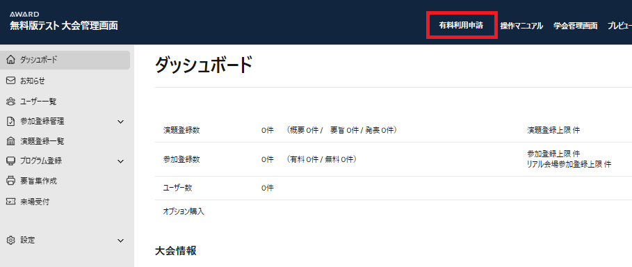 管理画面 上部 の有料利用申請より申請お願いします。