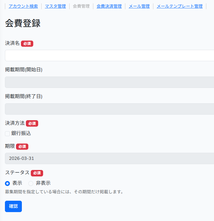 決済期間(開始日)(終了日) | ユーザー画面に日付表示 決済期間以外は決済できなくなります |