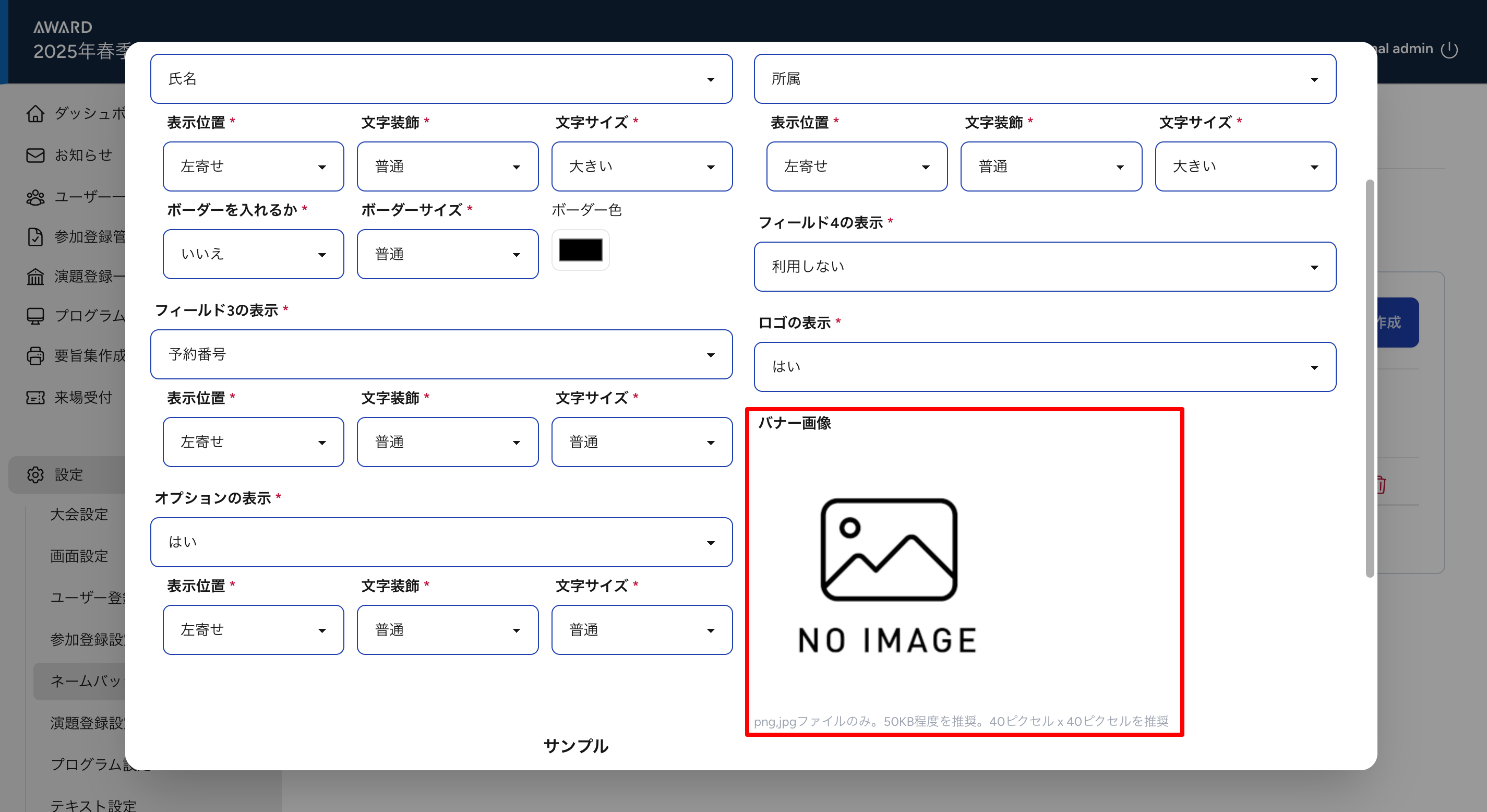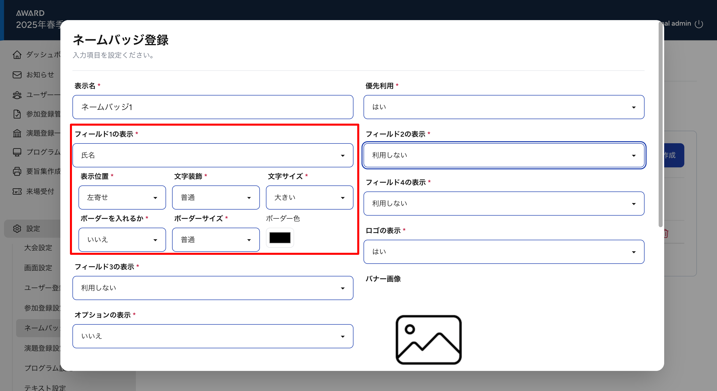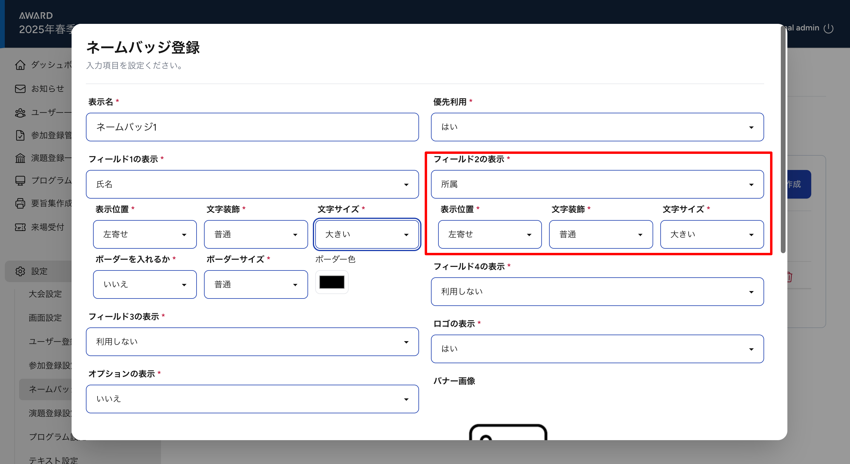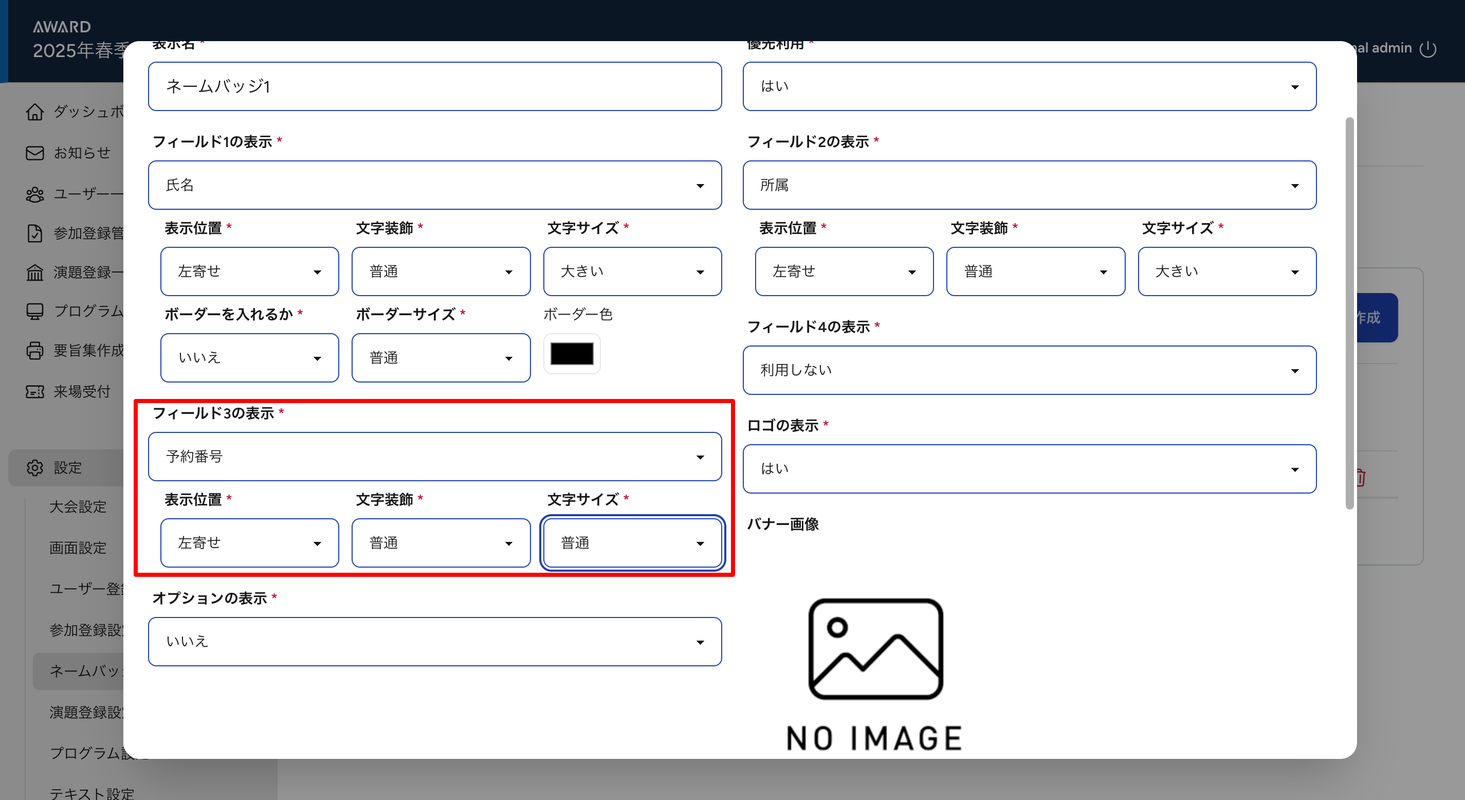 ④フィールド1の表示の項目(学会名・氏名・所属・予約番号)の設定をします。