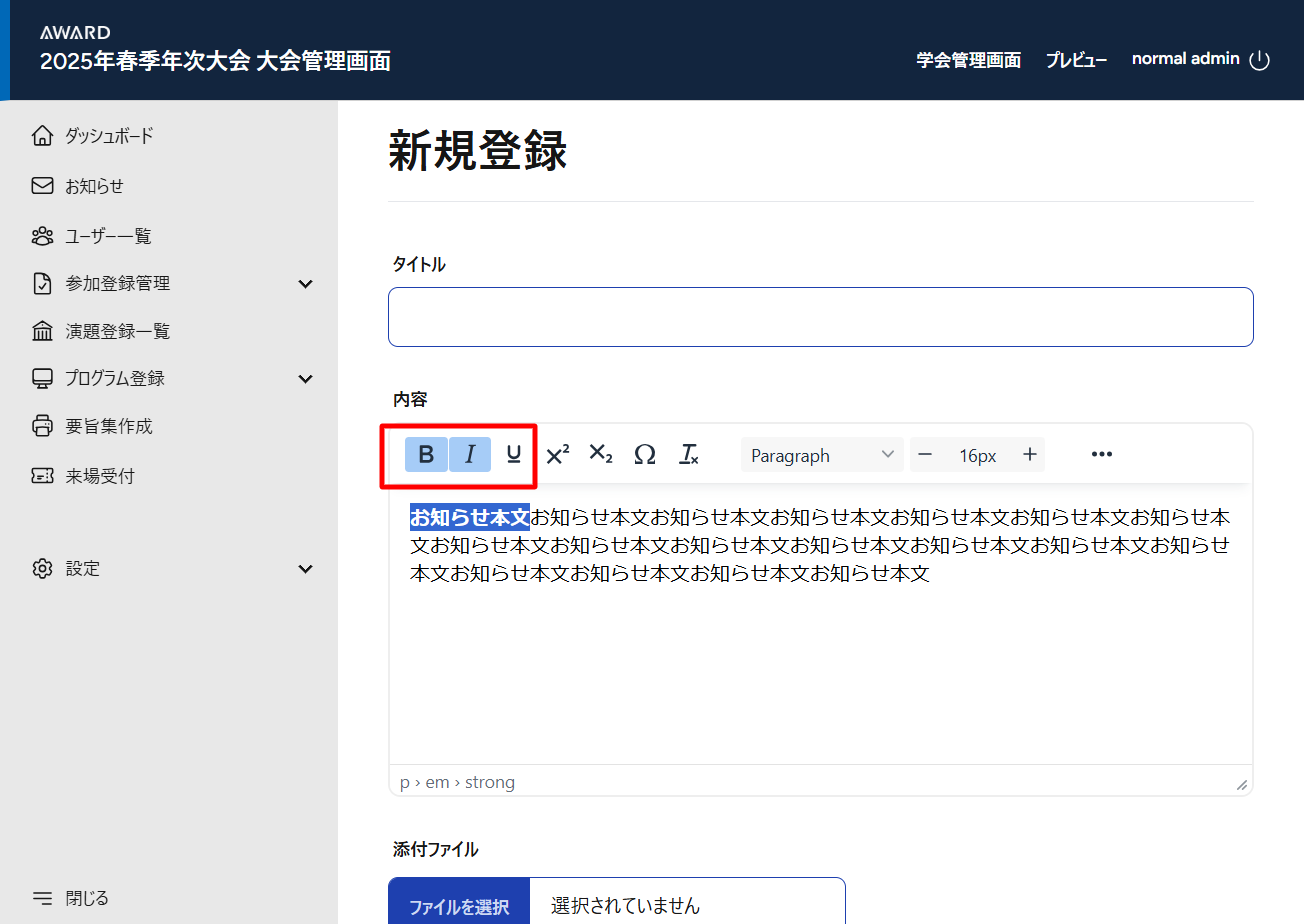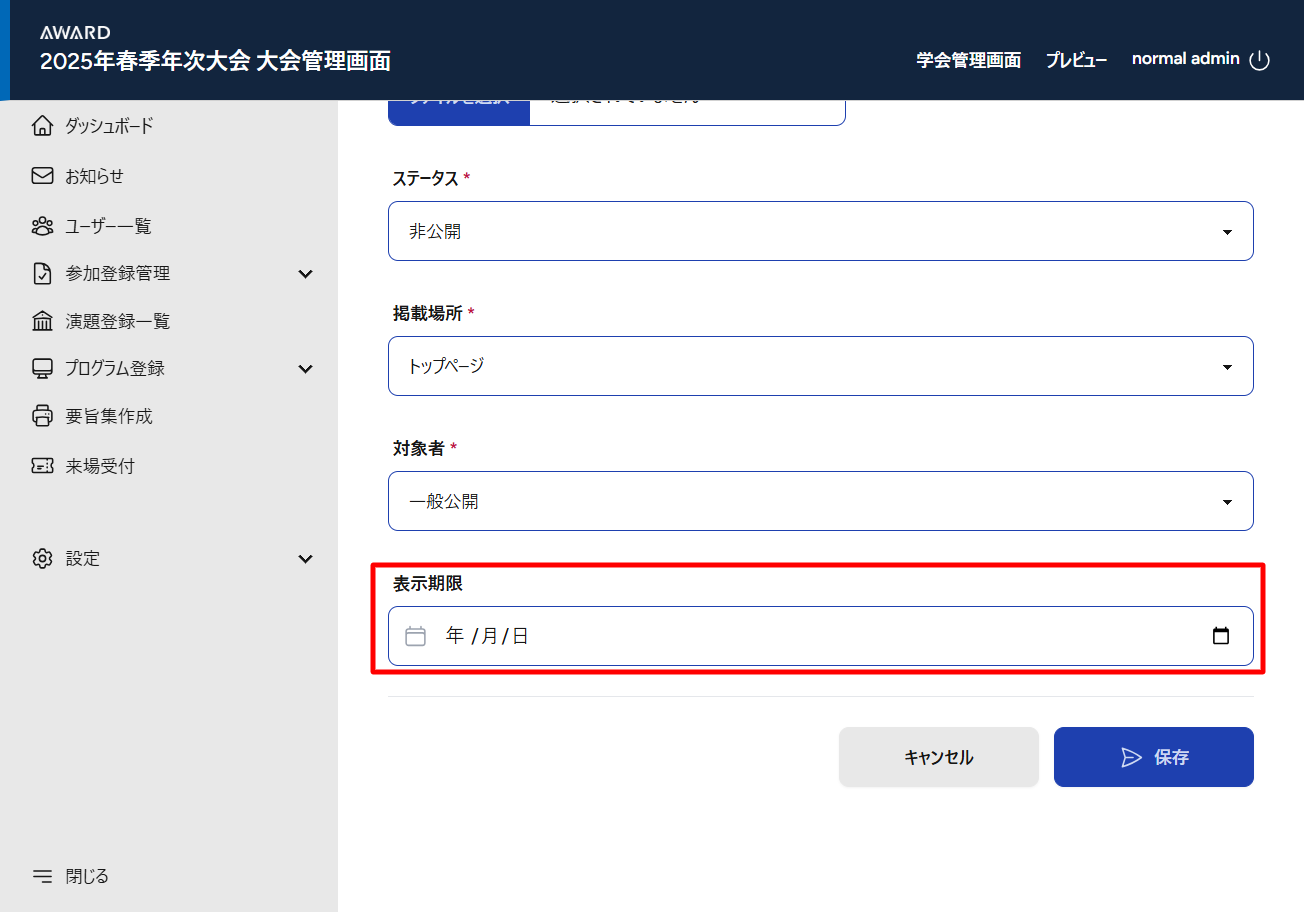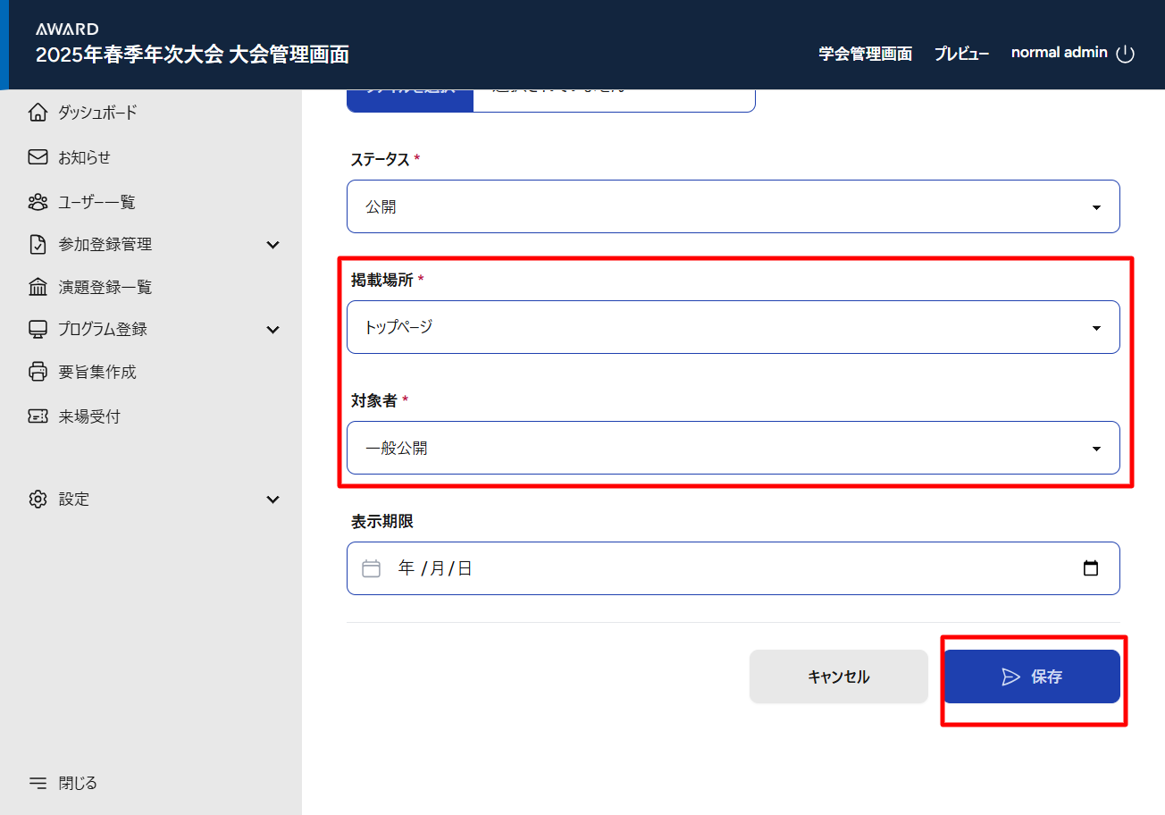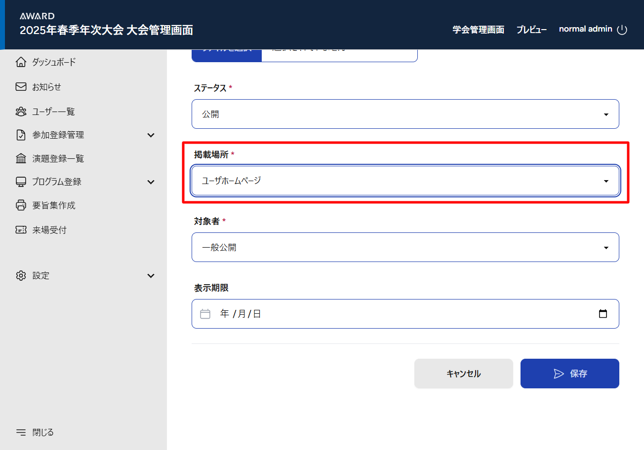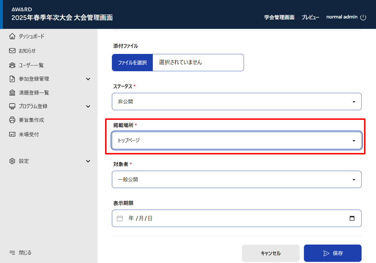 ・「掲載場所」は、トップページ・ユーザー登録ページ・参加登録ページ・演題登録ページ・ユーザーホームページから選びます。