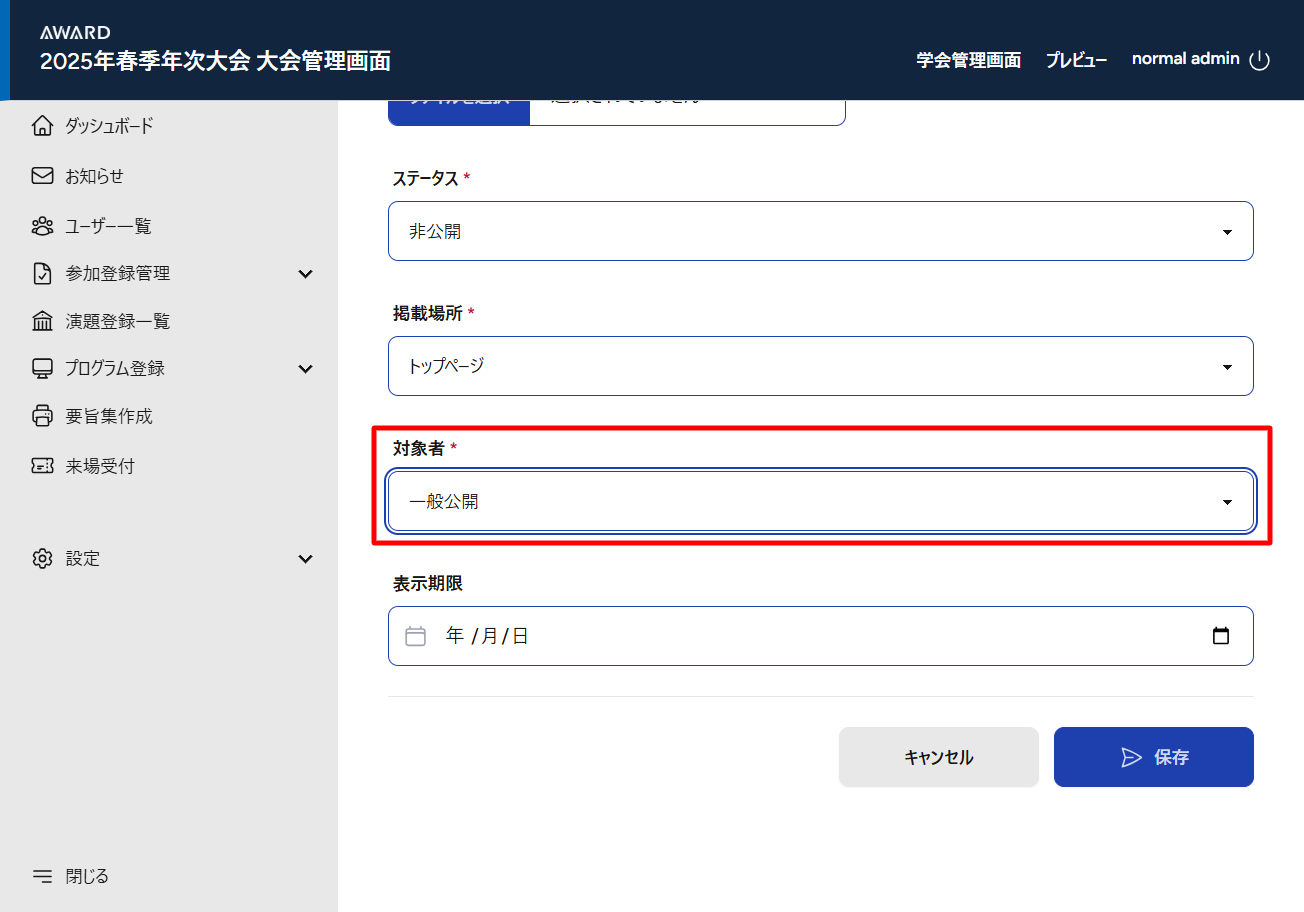 ・参加登録ページにお知らせを表示したい場合は、「掲載場所」を参加登録ページにします。
