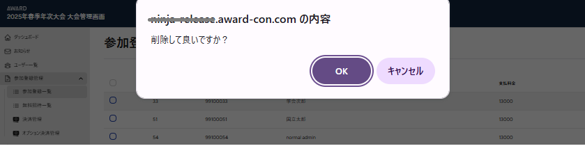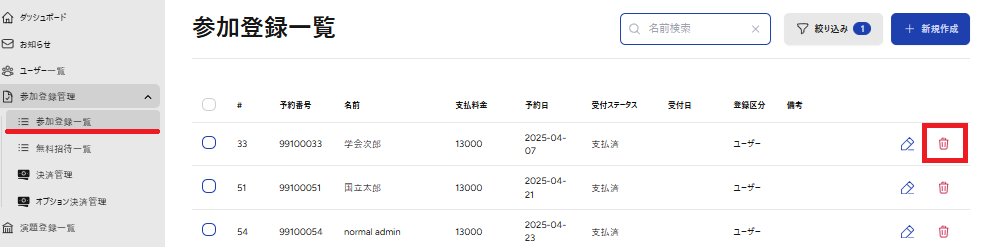(1)参加登録画面を開き、「参加登録一覧」からキャンセルする参加者の「削除」をクリックします