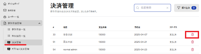 (1)参加登録管理>「決済管理」からキャンセルする参加者の「削除」をクリックします。