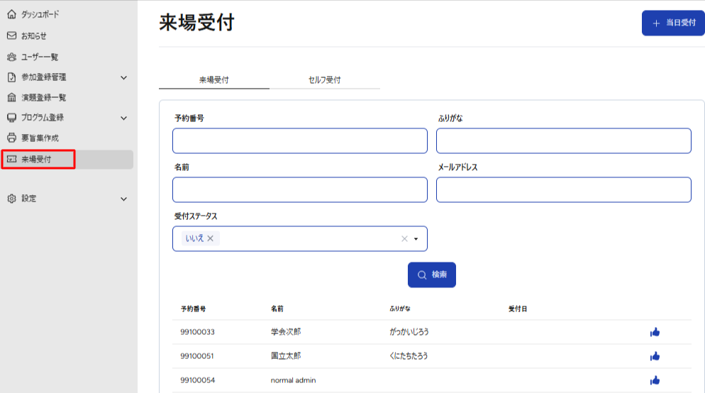 参加者が提示したバーコードまたはQRコードをリーダーで読み取り、該当者の「受付」ボタンを押すと参加証が印刷されます。
