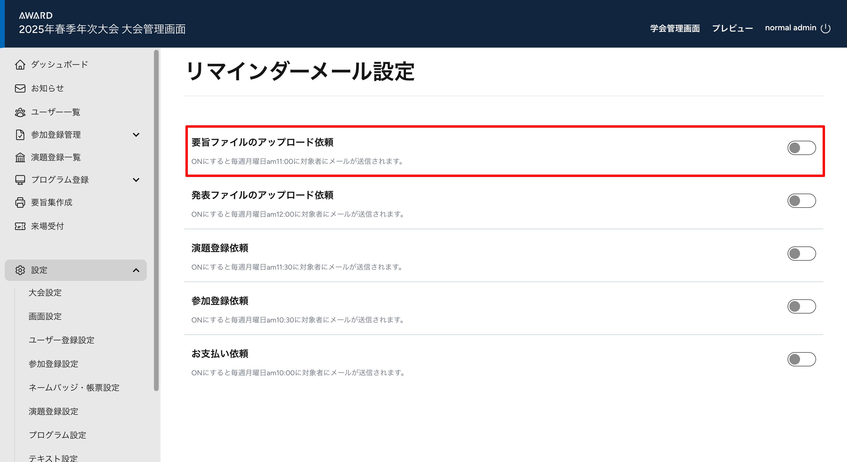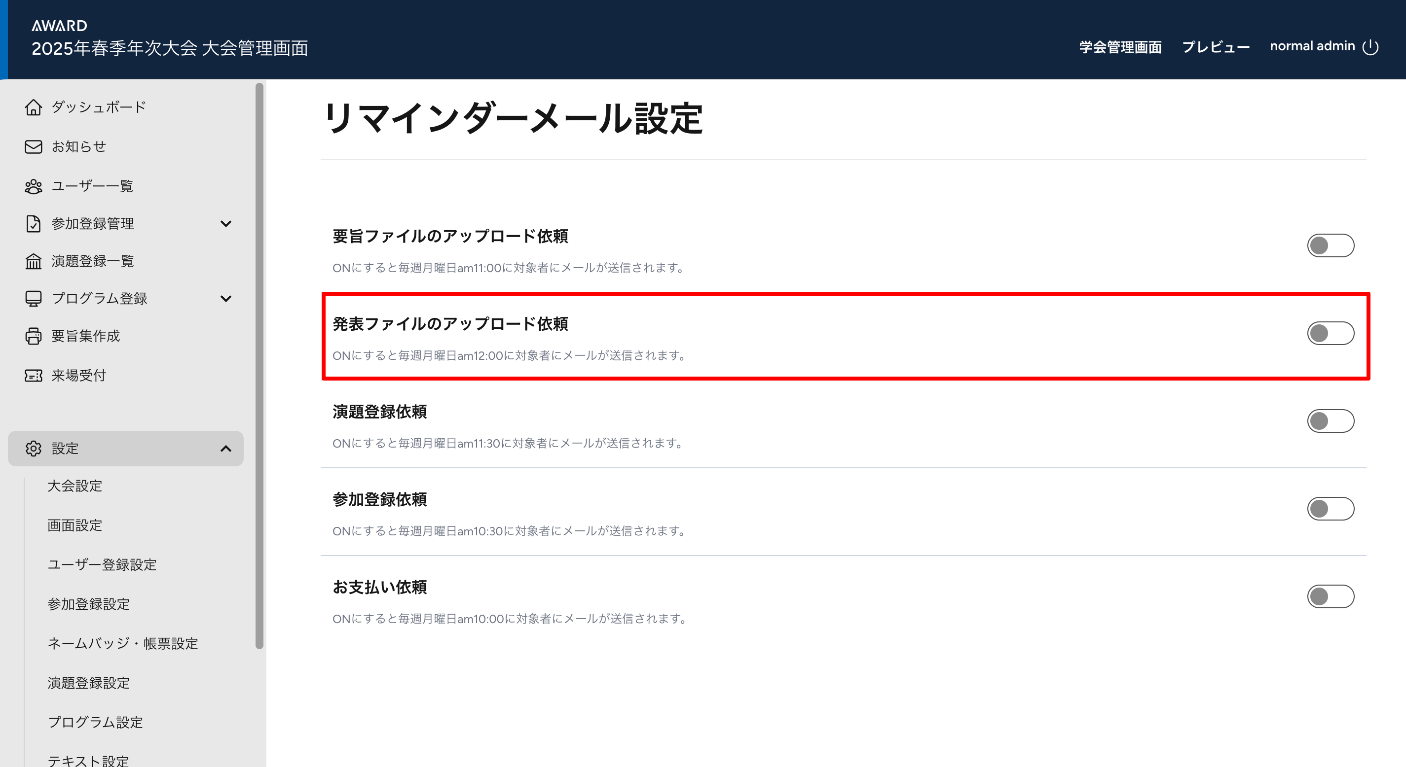 【発表ファイルのアップロード依頼】をONにすると、演題登録は完了しているものの、発表ファイルのアップロードが完了していない方に対して、正午(12:00)にメールが送信されます。