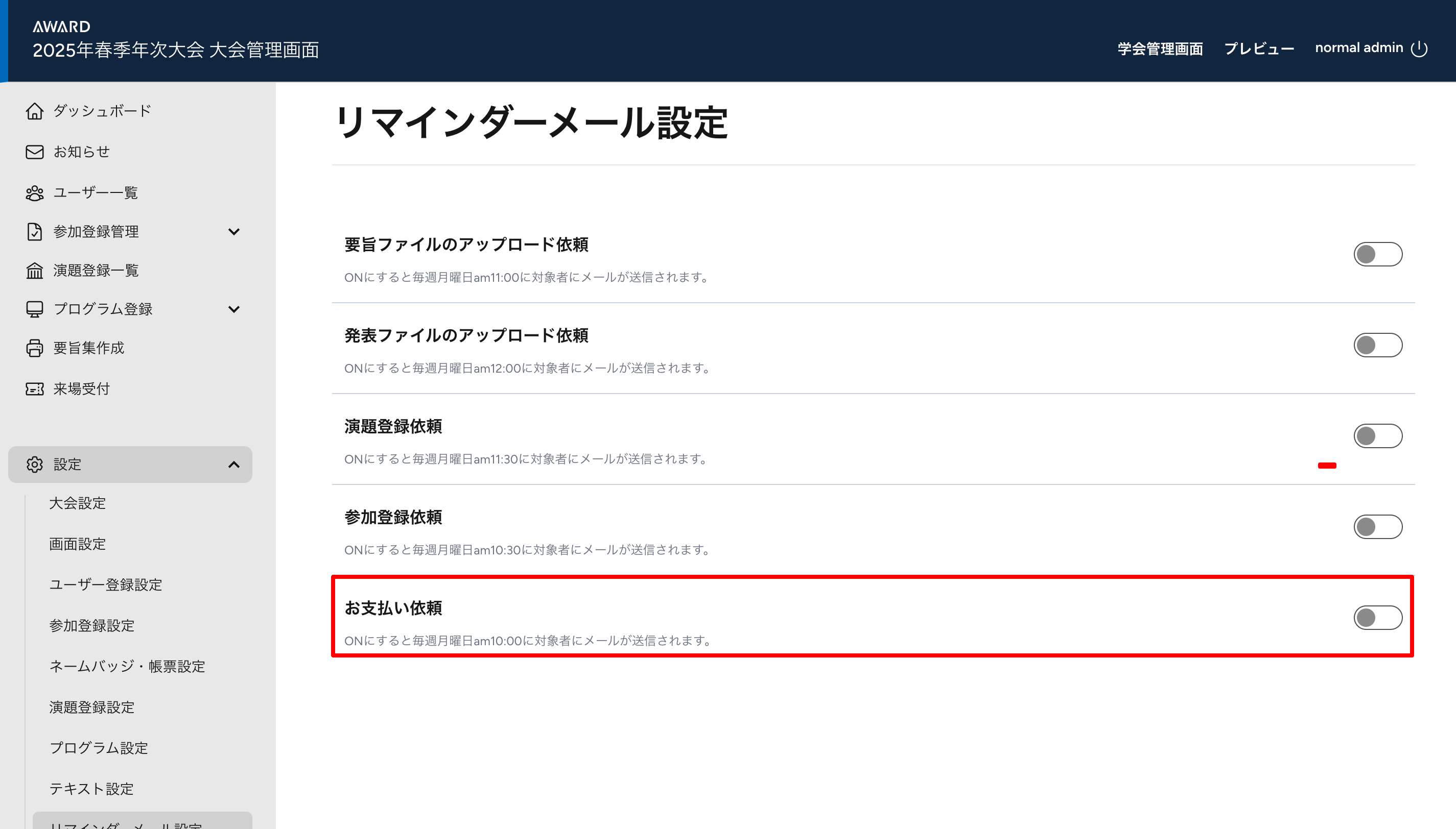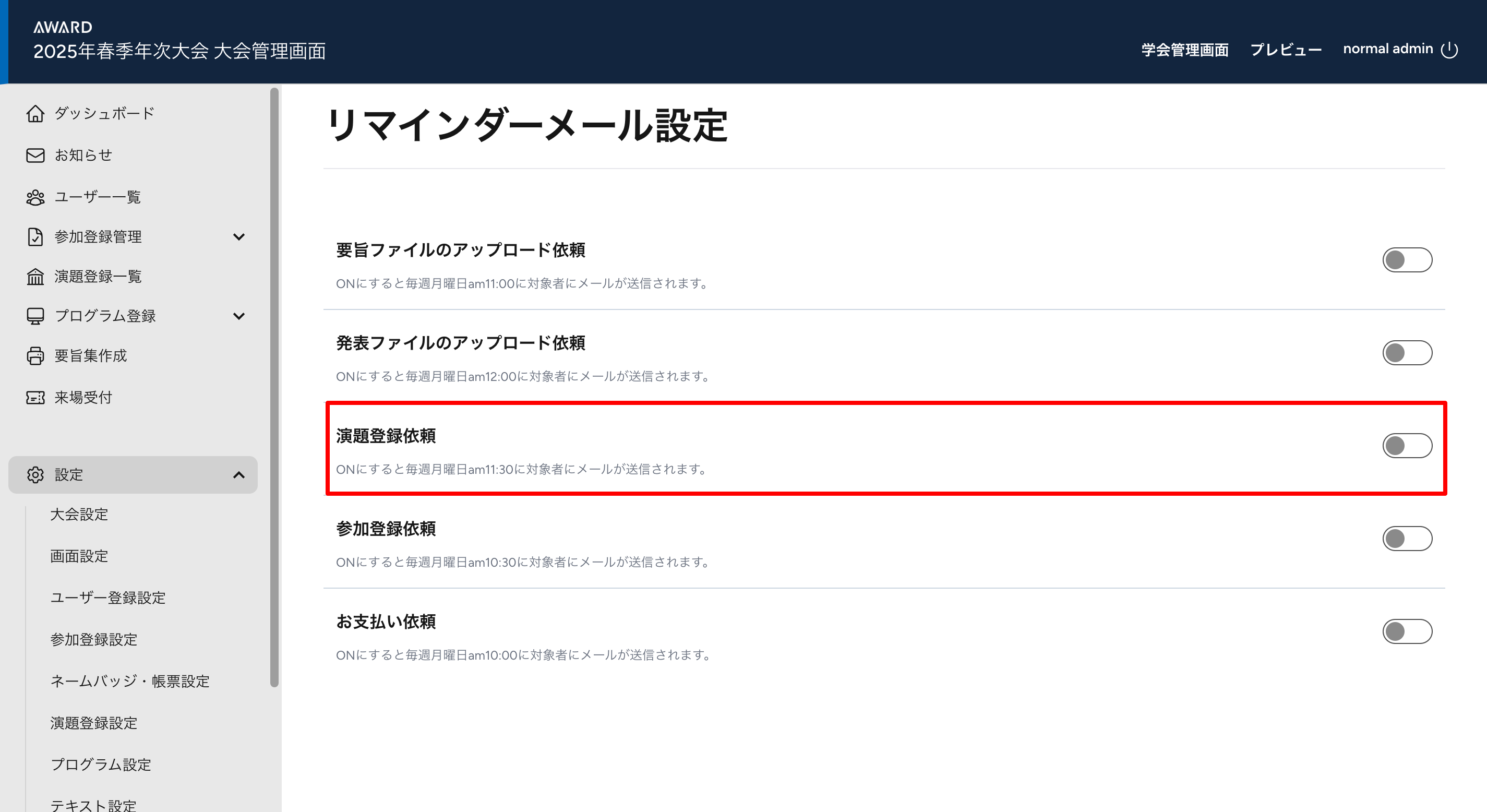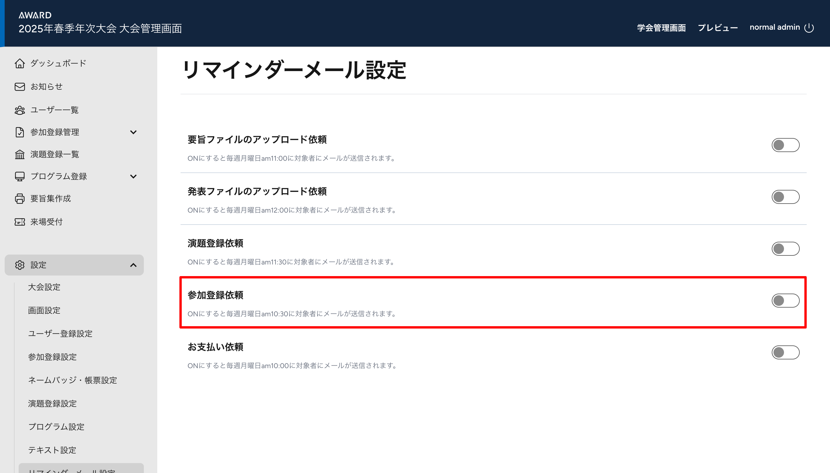 【演題登録依頼】をONにすると、演題登録されていない方に毎週月曜日午前11時30分にメールが送信されます。