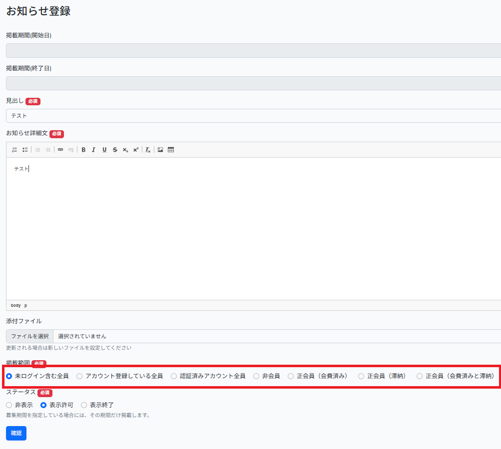 見出し :利用者のお知らせ一覧に出る「見出し」になります。