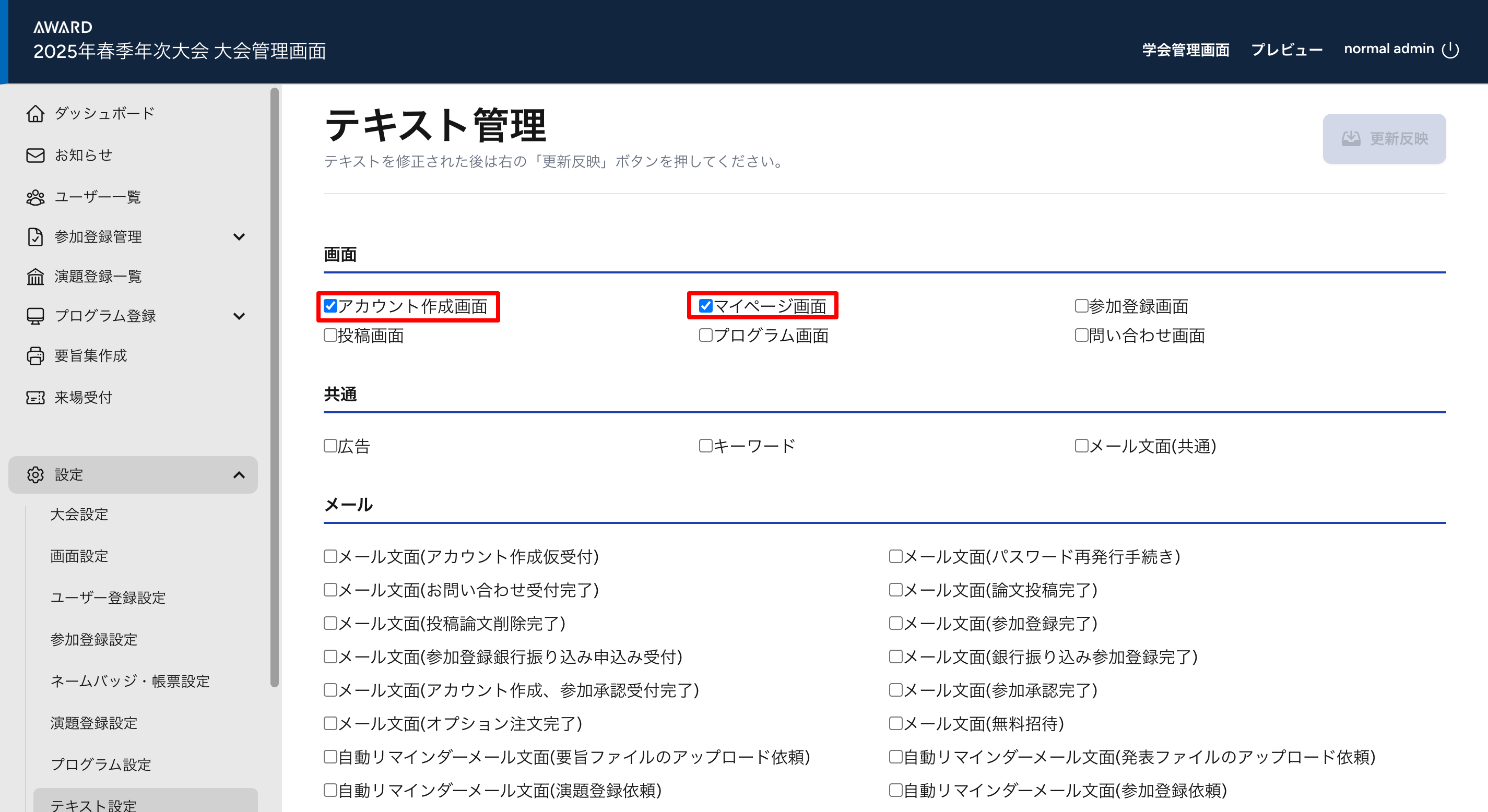 参加者側にある文言を全て変更することが可能です。例えば左カラムメニューにある【オプション購入】を【懇親会申込】や画面上部にある【開催概要】を【概要詳細】など自由に変更出来ます。変更する場合は、内容調整後に、更新ボタンを押す必要がありますので、ご注意ください。