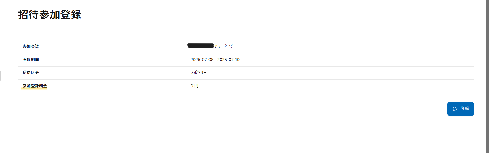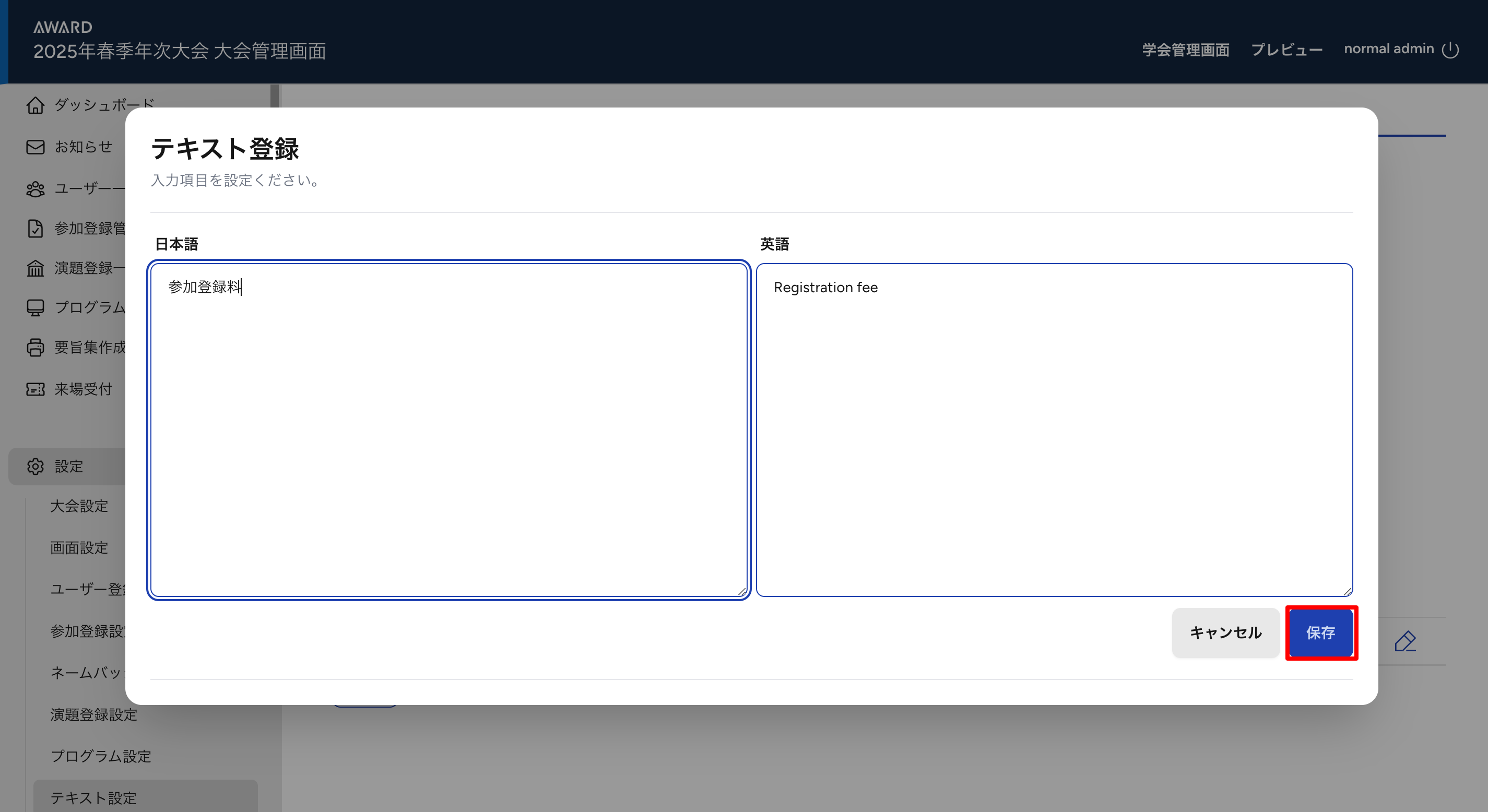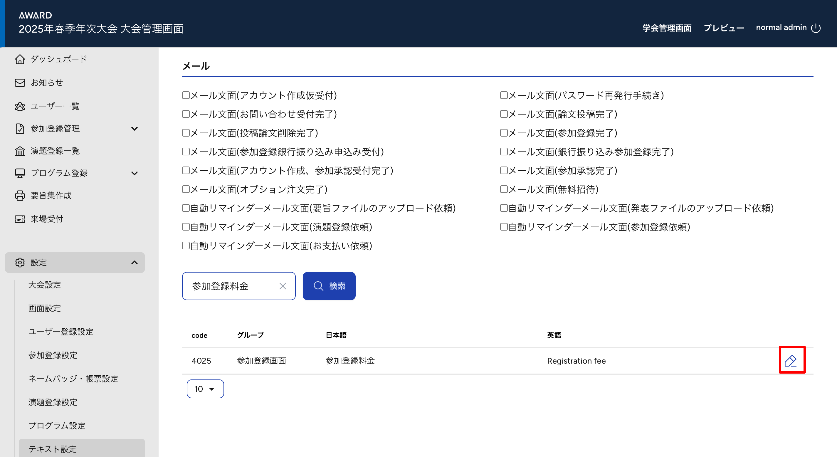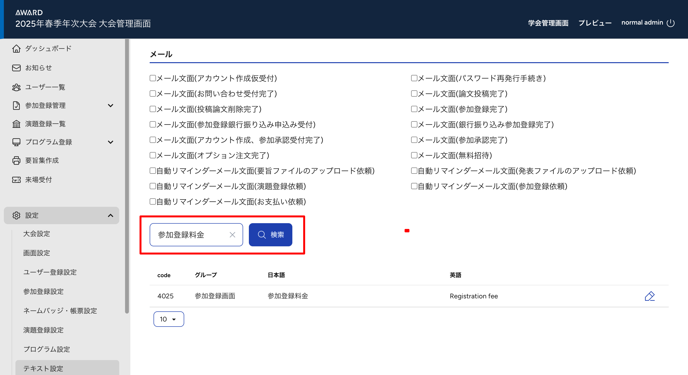 ・例:【参加登録料金】を変更する場合 > 「参加登録料金」と検索をかけます。